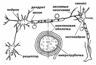 Внешне нейроны похожи на деревья: у них есть ствол — аксон, ветки — дендриты и корни — концевые разветвления; и, как нет абсолютно схожих деревьев, так нет похожих друг на друга нейронов, однако принципиальное построение их одинаковое. Так, в стволах нейронов — в аксонах — обязательно присутствуют микротрубочки диаметром от 5 нм до 30 нм, идущие вдоль всего аксона; идут они и по дендритам, и по окончаниям. Характерно то, что они нигде не разветвляются. В подвижных ресничках рецепторов микротрубочки упорядочены и объединены, как отмечалось выше, в жесткие кольца по 9 пар по окружности и дополнительной парой в центре, а в аксонах передающих нейронов они не упорядочены и расположены по одиночке или группами с выходом в дендриты и окончания. Точное назначение микротрубочек нейробиологам неизвестно: многие считают, что они помогают нейрону сохранять определённую форму и жесткость, выполняя функции корда или арматуры; другие же предполагают, что по микротрубочкам осуществляется перетекание жизненно важных веществ (рис .1.5).