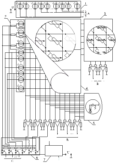 На схеме технической нервной системы (рис.1.15) выделен ещё один блок 6, который обеспечивает очувствление питанием, и который может перераспределять это питание по группам рецепторов; назовем его блоком переключения внимания системы; такое название отвечает его сути. Он состоит из ряда переключателей, соединяющих источник питания с отдельными группами рецепторов; шины, питающие эти группы, соединены между собой через резисторы, и поэтому подключение к источнику питания одной шины означает одновременно некоторое повышение напряжения питания соседних шин. Деление всего очувствления по группам рецепторов может выполняться различными способами: по видам очувствления (зрение, слух, осязание), по сторонам очувствления (спереди, сбоку, сверху) или даже произвольно.